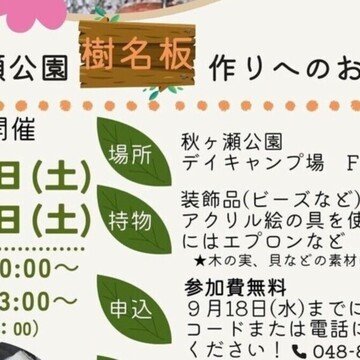 埼玉県立秋ヶ瀬公園ではなもく散歩の樹名板作りをやりませんか? 会場は秋ヶ瀬公園内デイキャンプ場になります。 完成した樹名板は10月に秋ヶ瀬公園内ピクニックの森に……