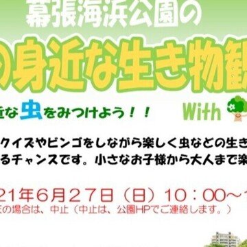こんにちは。 明日は、 午前中雨予報ですが、 千葉市美浜区は降水量は少ないようなので、 予定通り幕張海浜公園での「初夏の身近な生き物観察会」および「パーククエスト」は……