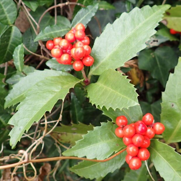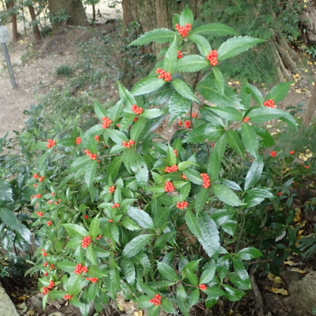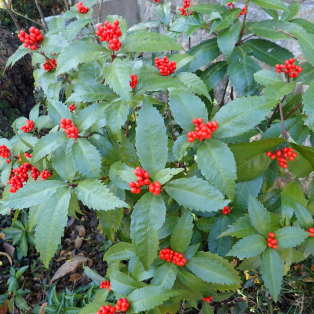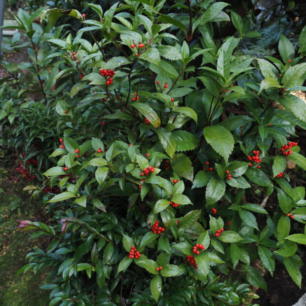 つやつやの緑の葉の上に、 つやつやの赤い実。 センリョウといえばお正月に活けるおめでたい木です。