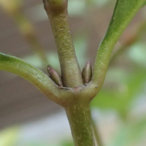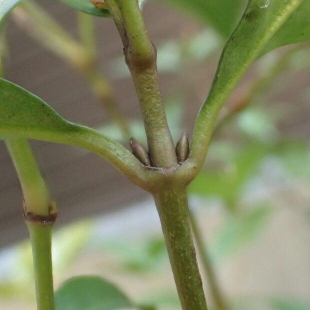 葉や枝と同じような色のツンととがった芽です。 毛や、 芽を包む皮はありません。