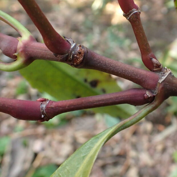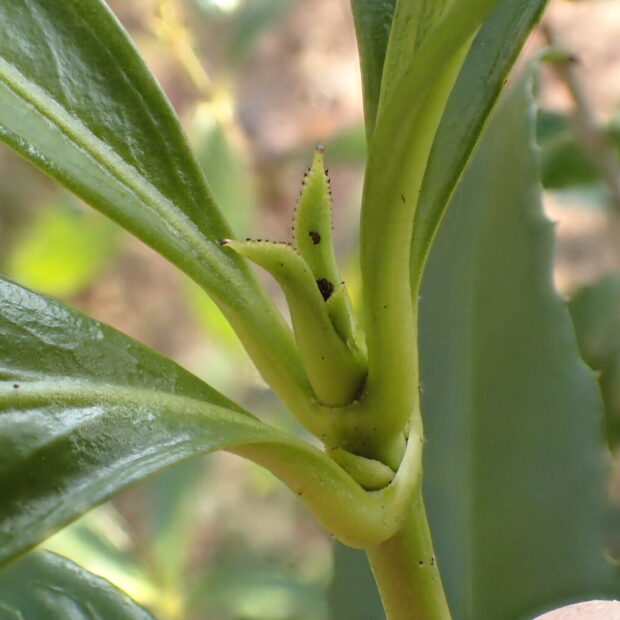 先がとがり、 するどいギザギザのある葉です。 対生で、 2枚の葉が向かい合ってつきます。 枝から伸びる2枚の葉は、 つけ根で滑らかにツルンとつながって見えます。