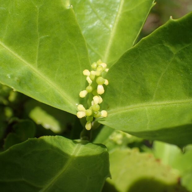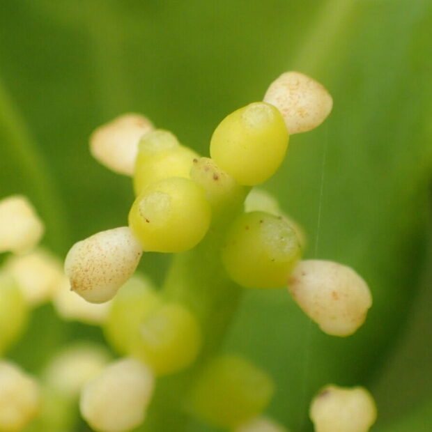枝先にかたまって咲きます。 あとで実になる部分である子房に、 丸っこい雄しべが1つついていて、 花弁やガクはなく、 「これが花?」というような形です。 原始的な、 古い時代の植物なのです。