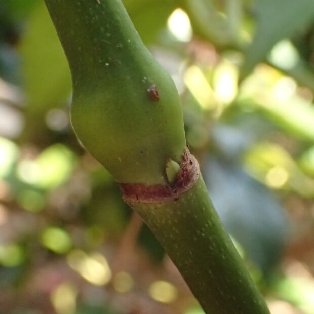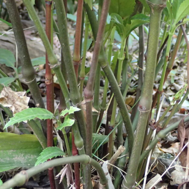 幹、 枝は緑色や褐色であまり太くはならず、 木質化もしません。 株元からたくさんの幹を伸ばし、 支え合っているように見えます。 枝分かれしたり実がなったりすると、 株の外側の枝は重くなって倒れ込むことがしばしばです。