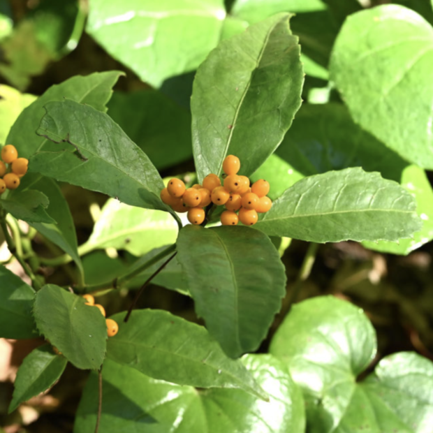 十字についた緑色の葉の真ん中に、 赤い実がかたまってつきます。 よく目立ち、 鳥が食べにやってきます。 よく見ると、 へそのような雌しべの柱頭のあとと、 横にポチッと雄しべがついていたあとがあります。