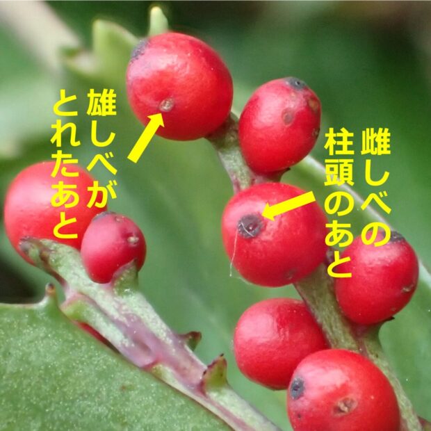 センリョウは花の形がへんてこで変わっています。 めしべの横からおしべがたんこぶみたいに出ています。 ガクも花びらもありません。 なぜならセンリョウは古い時代に生まれたから。 まだ花らしい花なんてなく、 原始的な花の先駆けなのです。 黄色いいぼいぼの花を眺めると花が生まれた歴史を感じることができます。 赤い実の黒い点々はおしべとめしべのあとで、 飾らずにありのままを見せています。