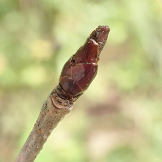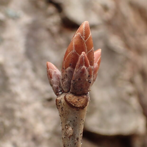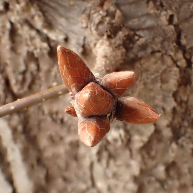 たくさんの芽鱗が魚のうろこのようにきっちりと並ぶ、 明るい褐色の冬芽です。 枝先の頂芽の周りに少し小さな芽がたくさんつきます。 上から見ると、 五角形なのがわかります。