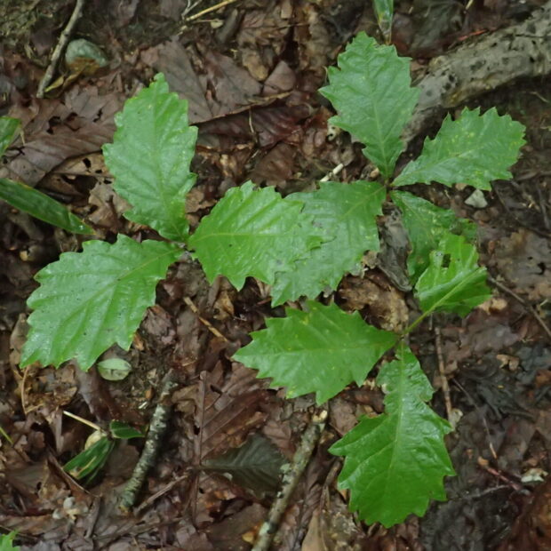 どんぐりは落ちてから、 水分などの条件がよければ根を出して冬を越し、 春が来てから地上に枝を伸ばして葉を出します。 どんぐりの中に入っていた子葉(ふたば)は地上には出ず、 本葉だけが地上で開きます。