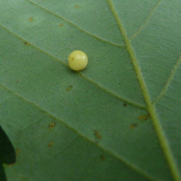 どんぐりは半年ほどで熟し、 柄がついたまま落ちます。 殻斗(どんぐりの帽子)は、 つけ根に近い方の半分ほどが、 屋根の瓦が重なるように並びます。 あとの半分(帽子のふち)は、 どんぐりにキュッとフィットするかのような細かいポツポツ模様です。