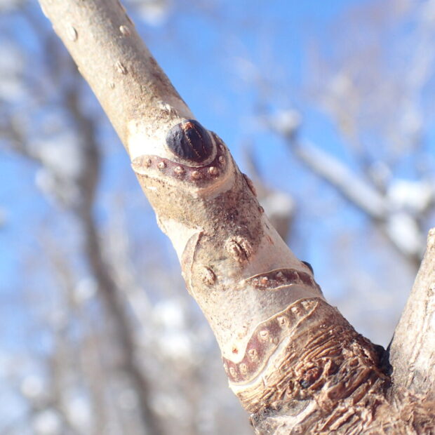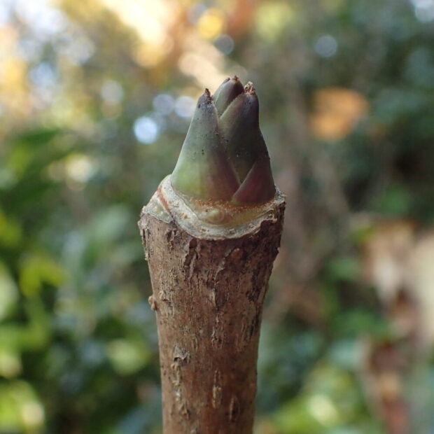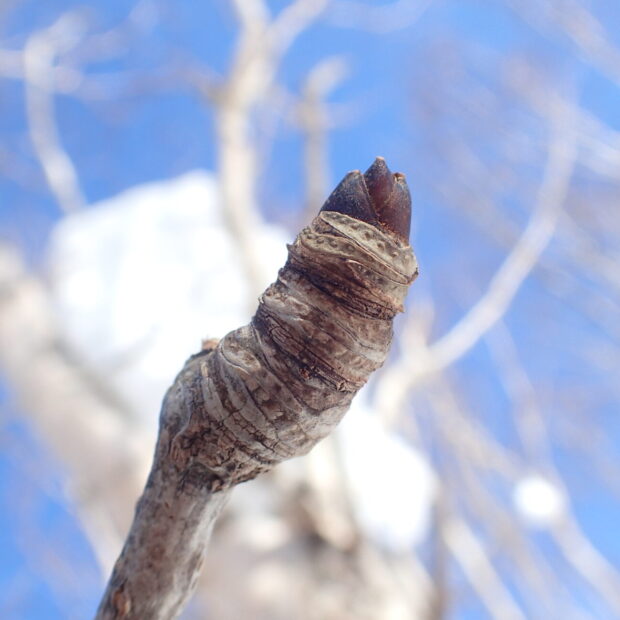 枝や幹が太いわりに、 芽はチョボっとした三角帽子のような形です。 タカノツメの冬芽とよく似ていますが、 コシアブラの方が少し枝が太いことと、 三日月型の葉痕の維管束痕が約13こあり、 タカノツメより多いのが特徴です。