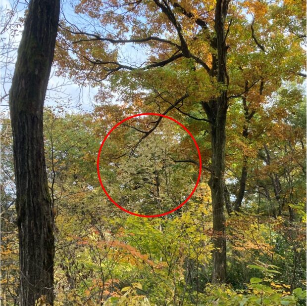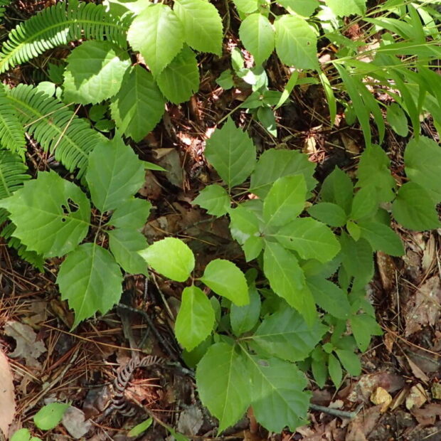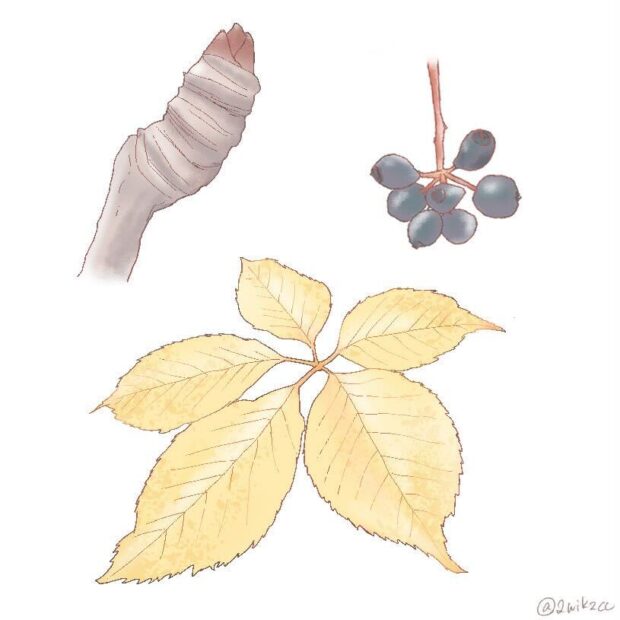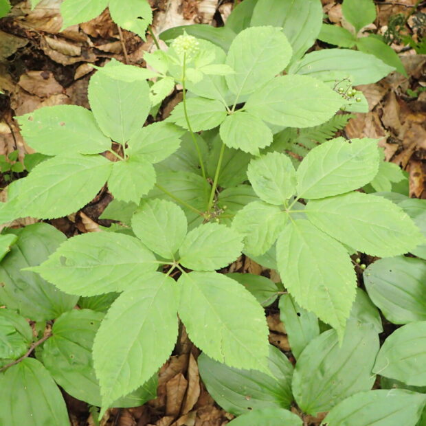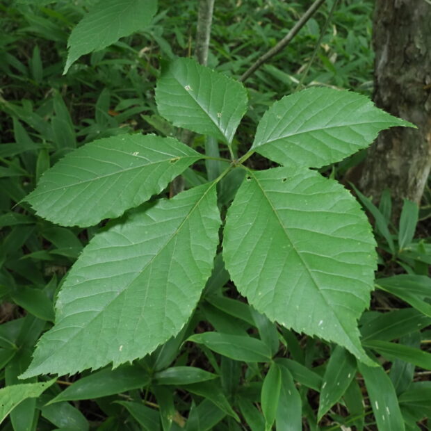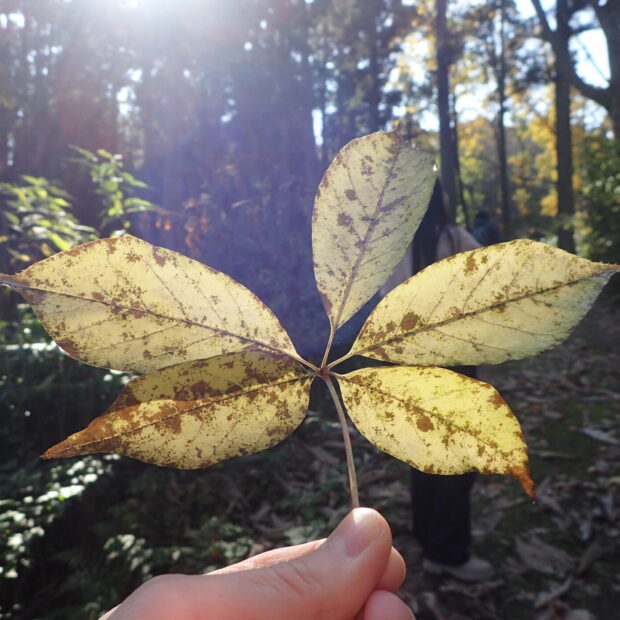 春の山菜として天ぷらにするのはまだ小さな縮れた葉ですが、 伸びてピンとした葉は5枚一組。 秋、 薄く白っぽい色に黄葉すると森の中に生えていたことに気づきます。