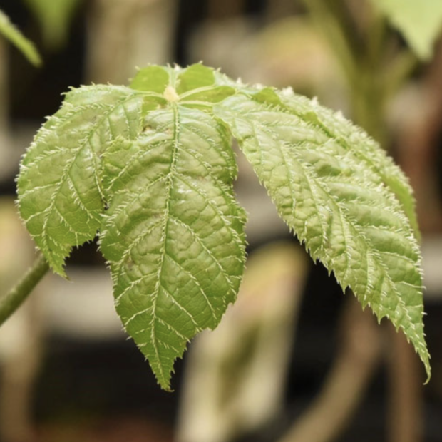 5枚一組で1枚の葉で、 長い柄があります。 小さな葉の一つ一つにもはっきりとした柄があり、 先の方はピュンととがります。