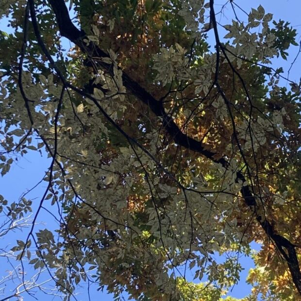 コシアブラは秋の黄葉が少し他の木と違って目立ちます。 レモンイエローの黄葉もありますが、 色が抜けて白い緑のような時もあって、 きれいです。 紅葉なのに亡霊?みたいな透け感の有るはかなさです。 山に普通に生えていて、 緑の時期には目立たない木です。