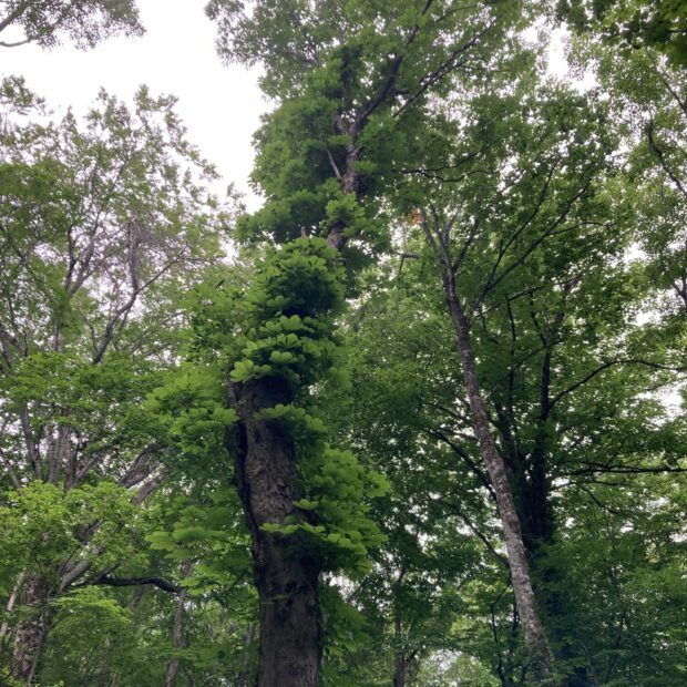 コシアブラのある森の中では、 大きな木の下にたくさんの幼木がいます。 5枚一組の葉は互生につきますが、 左右対称に広げて、 光を得ようとしています。