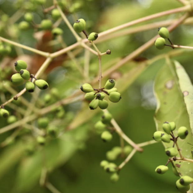 新しい枝の先に、 つぼみがたくさんついた柄が伸びてきて、 黄緑色の小さな花を咲かせます。 花びらが5枚で、 長い雄しべが5本ピュンピュンと飛び出しています。