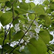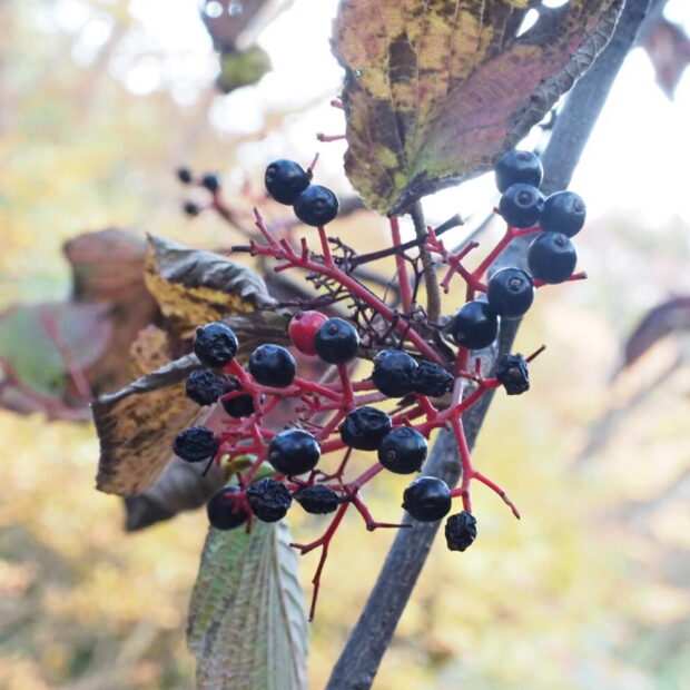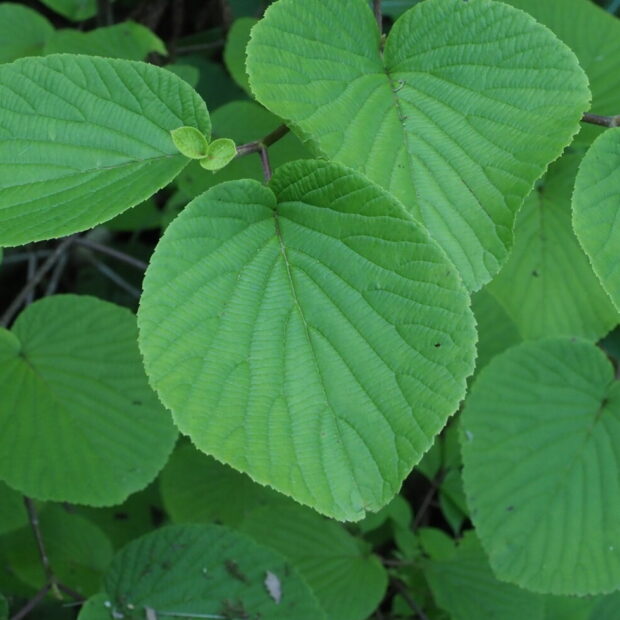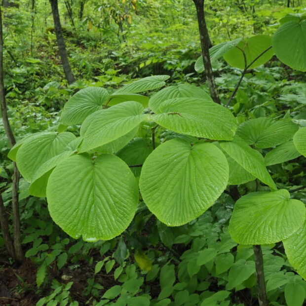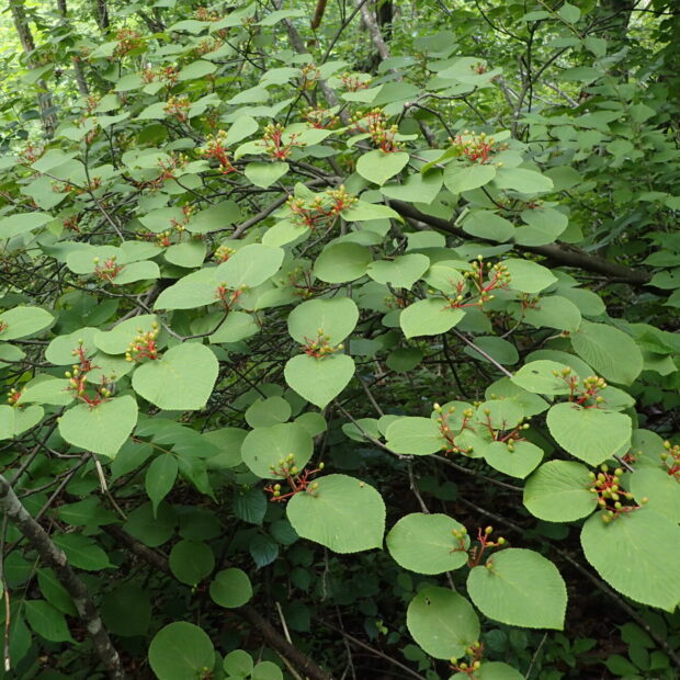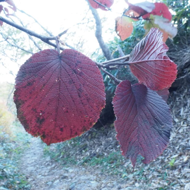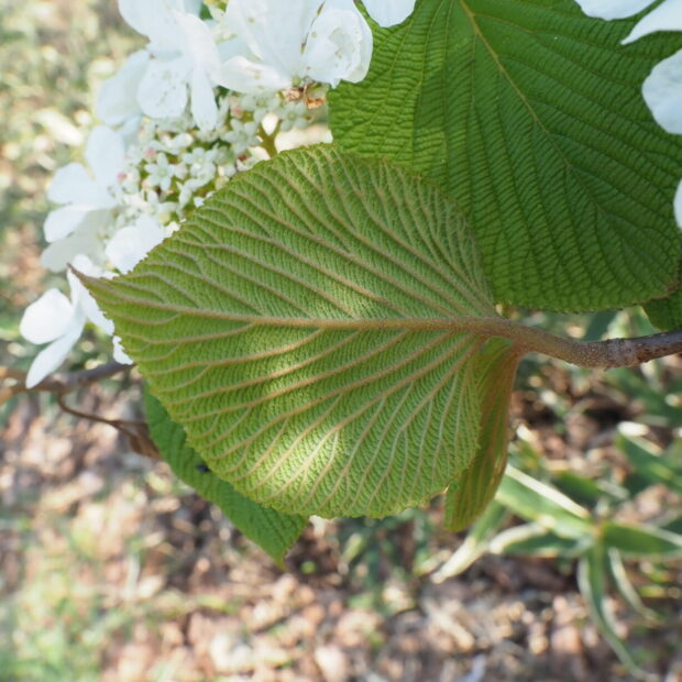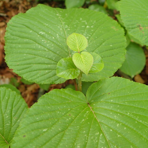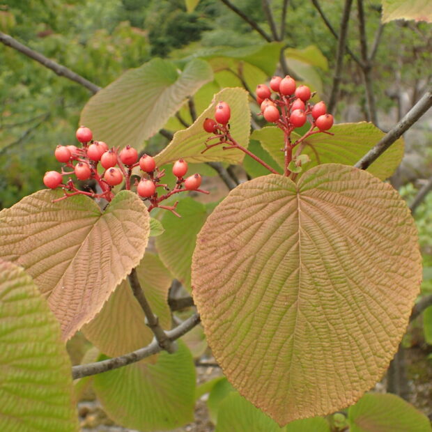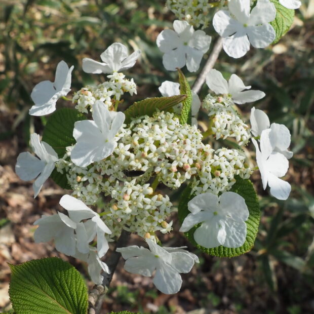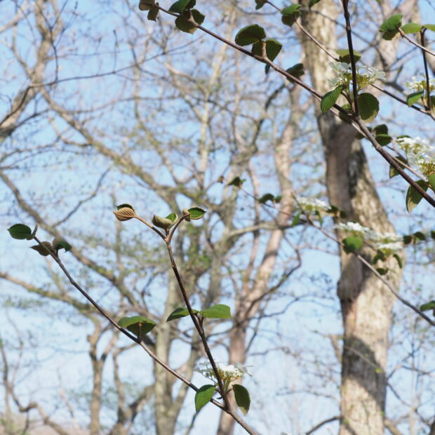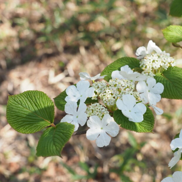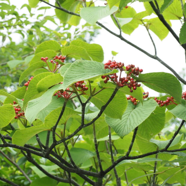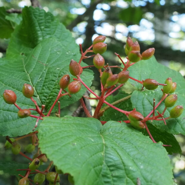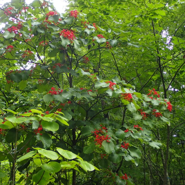 カメの甲羅のような大きな丸い葉、 白い装飾花とともに咲く花、 鳥たちへ存在をアピールする赤い実、 バンザイしている冬芽などなど、 森の中で目をひく要素満載の木です。