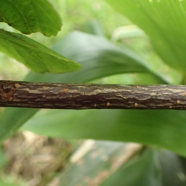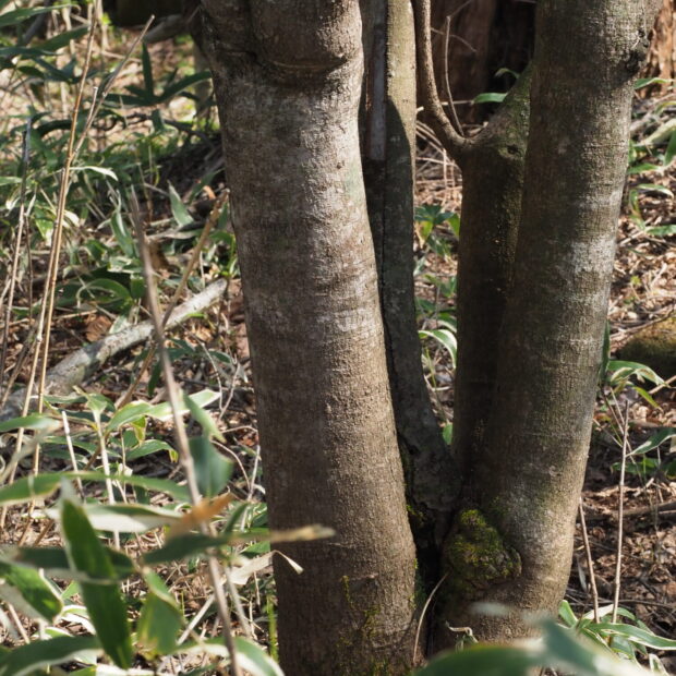 暗い灰色をした幹です。 若い枝には縦の筋とポツポツの皮目があります。 枝の分かれ方がシカの角のような形で、 横に伸びていくのが特徴です。