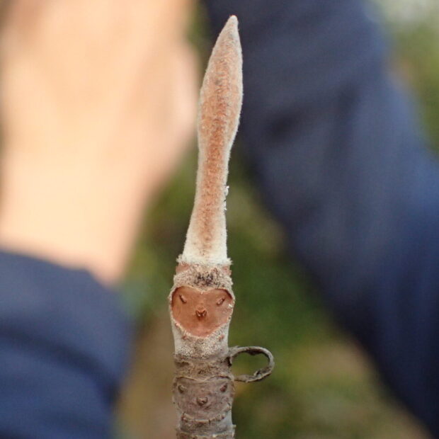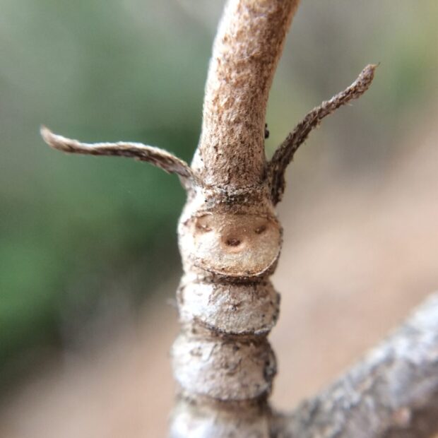 葉芽だけのものもあります。 葉痕の維管束痕は3こでお顔に見え、 短枝にはお顔が並びます。