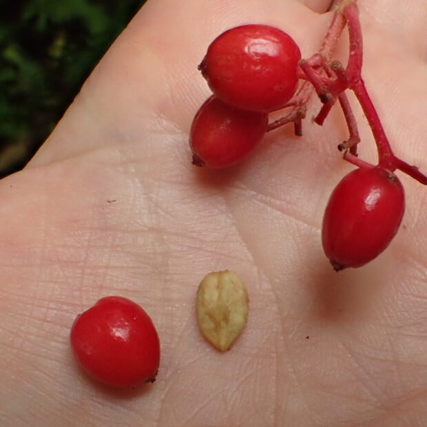 丸い実がたくさん集まってつきます。 寒さの深まりとともに、 黄緑色、 赤色、 黒色と熟していきます。 実の中には1つずつ種が入っています。