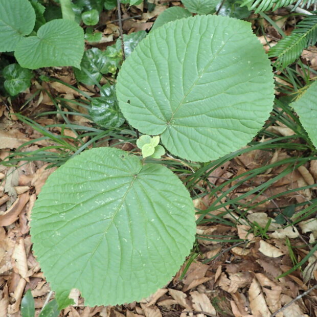 丸くて大きな葉で、 つけ根のところがキュッと内側にくぼみ、 丸いけれどもハート型のような形です。 葉脈はほぼ平行に並び、 縁には細かいギザギザがあります。