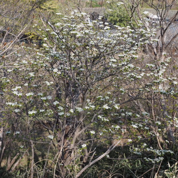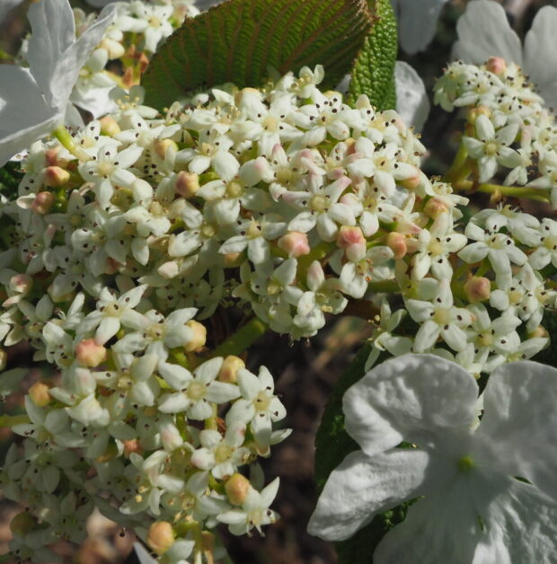 春、 まだ小さな1対の葉とともに花芽が伸び、 ガクアジサイのような花が咲きます。 周りに並ぶ装飾花は5枚の花びらに見えますが、 よく見ると1枚につながっています。