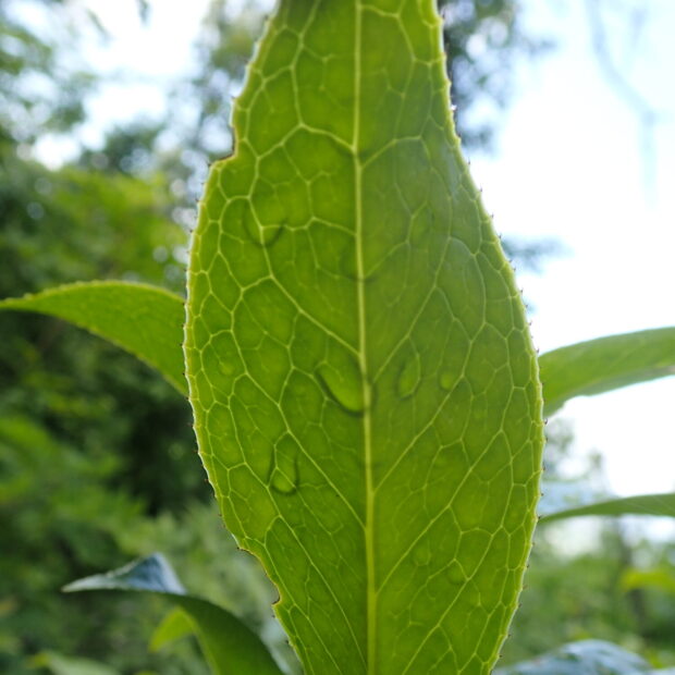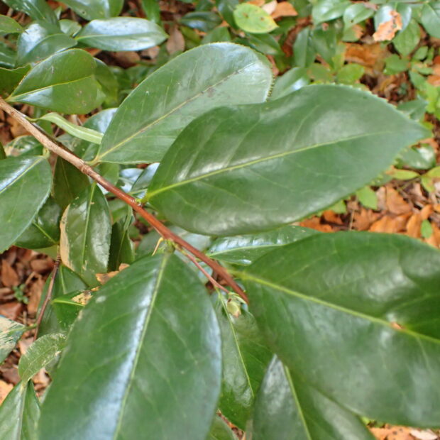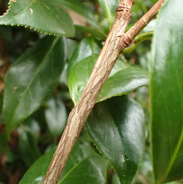 互生につきます。 葉の厚みはヤブツバキより薄く、 縁のギザギザはヤブツバキより鋭くとがります。