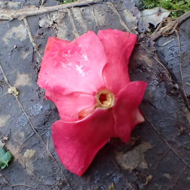 花には鳥ではなく虫がやって来ることによって、 受粉の手伝いをしてもらいます。 虫を呼ぶために、 雄しべの軸が黄色なのです。