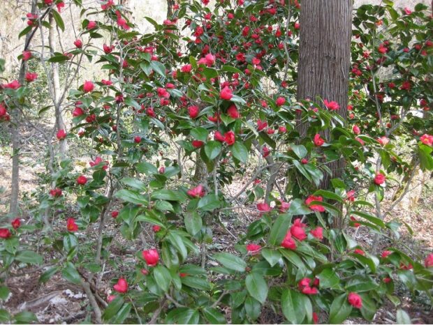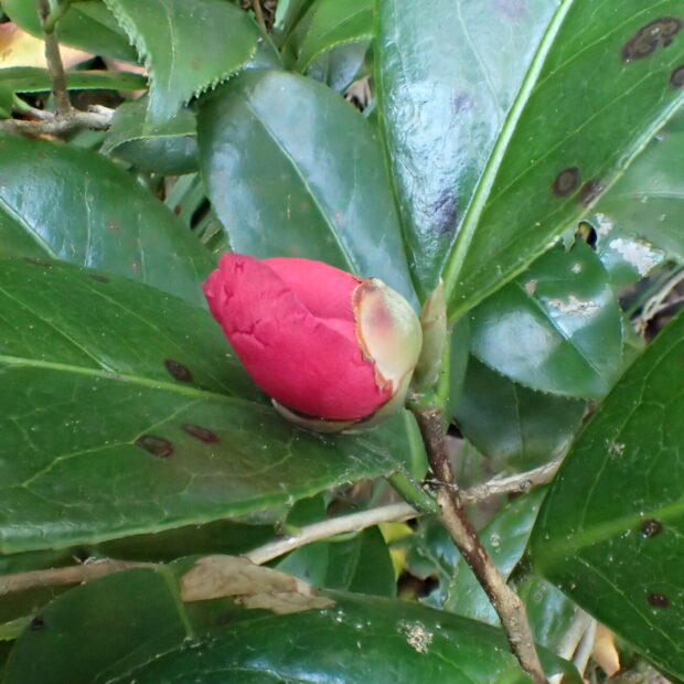 雪が解け始めたころから、 枝先に一重の赤い花をつけます。 花びらの厚みはヤブツバキより薄く、 雄しべの軸はオレンジ色がかった黄色であることが特徴です。