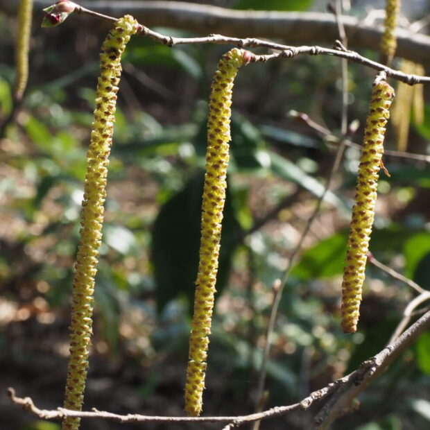 葉が出る前に、 雌花と雌花が別々に咲きます。 雌花には花びらのようなものはなく、 赤い雌しべがピロピロと出てイソギンチャクのような花です。 雄花の集まりは紐のように垂れ下がります。