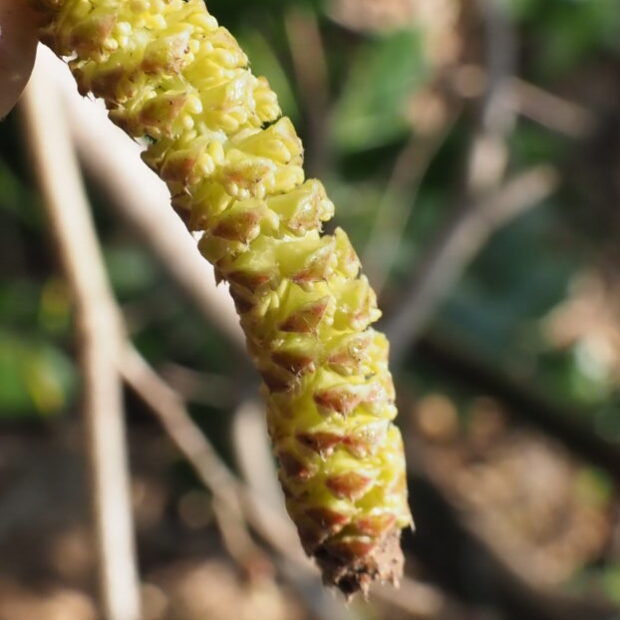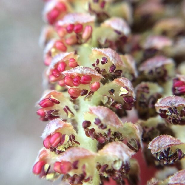 • 小さな屋根のような苞の内側に雄花が1つずつついている