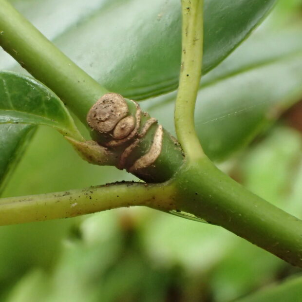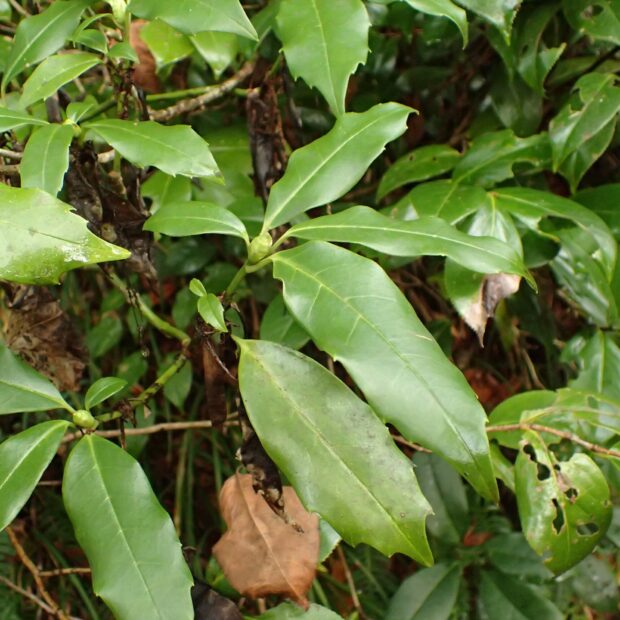 高さ1mほどの常緑樹です。 枝はまばらに生え、 大きな木の下でこんもりとした株立になったり、 はうように横に広がったりします。