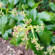 日本海側に分布し、 雪の多いところに対応した少し小さなアオキなので、 ヒメアオキと呼びます。 秋に熟した赤い実は春まで残り、 春には緑の葉っぱと赤い実、 新しく咲いた紫色の小さな花を一度に見ることができます。