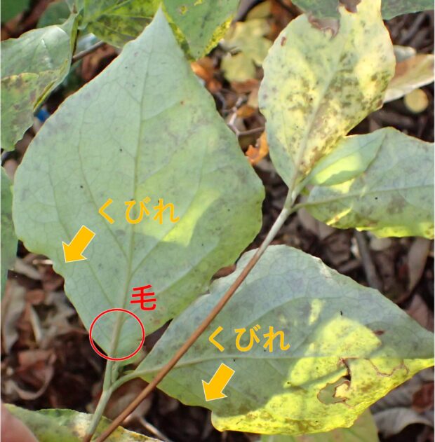 丸っこい菱形の葉で、 枝先に3枚並びます。 ミツバツツジの仲間は同じような形の葉をつけるので、 見分けることが難しいのですが、 付け根に近いところが少しくびれることが多いようです。 葉の柄に毛がないことも特徴です。 葉裏の付け根の葉脈のところには少し毛があります。
