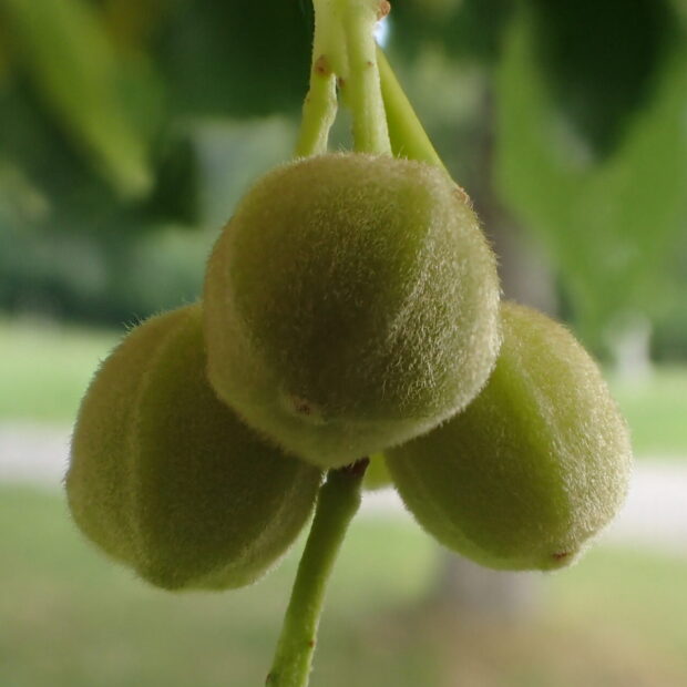 オオバボダイジュによく似たシナノキは、 北海道から九州までの山地に自生する木です。 オオバボダイジュに比べて葉は小さく、 表面には毛もなくてツルツルしています。 花の雄しべは花びらより長くて、 ふさふさと飛び出しているのが特徴です。 実は丸くて、 オオバボダイジュのように出っ張った「稜」はありません。