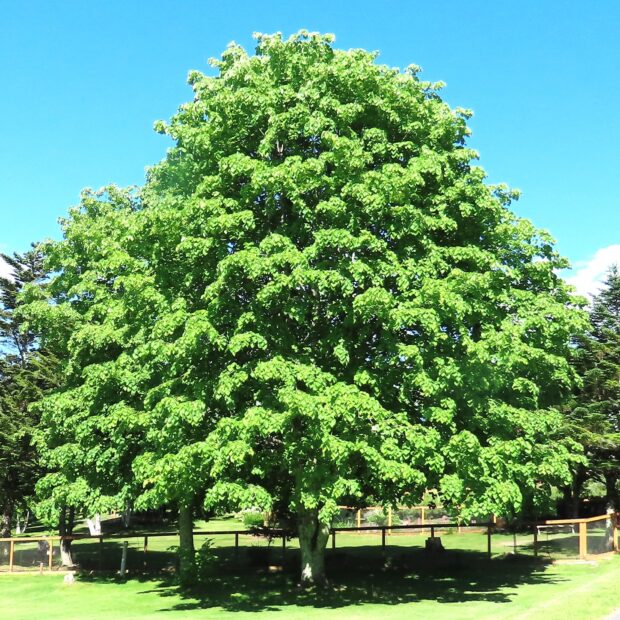 北陸より北の山地に自生するシナノキの仲間で、 シナノキより葉が大きく、 大木になります。 樹皮の繊維から布や縄が作られてきました。 種子の柄にはプロペラがついていて、 回転しながら落ち、 遠くへ運ばれます。