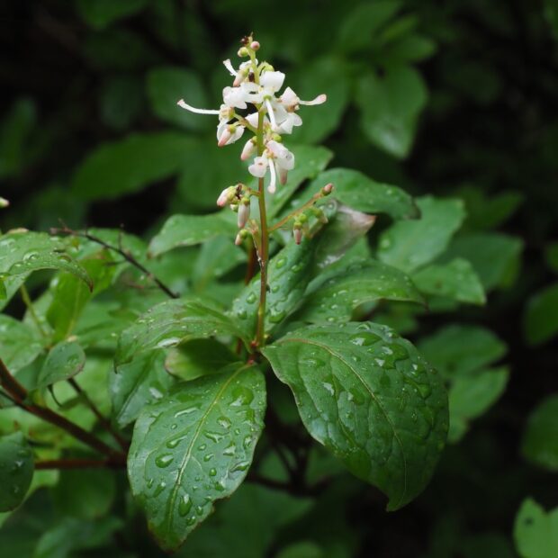 ツツジの仲間ですが、 見慣れたツツジとは違い、 枝先に穂のように上に伸びる柄にまとまって花を咲かせます。 咲くのも普通のツツジより遅い時期です。 秋には丸い小さな実をつけ、 熟すとパカッと割れます。 木全体には強い毒があります。