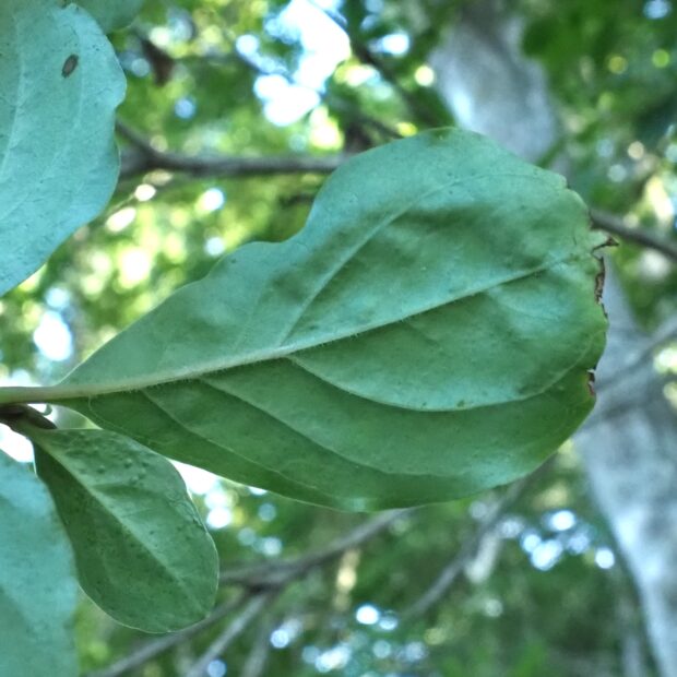 枝先に菱形のような形の葉がぐるりと5枚ほどまとまってつきますが、 互生です。 葉の縁は波打ち、 少しシワシワに見えます。