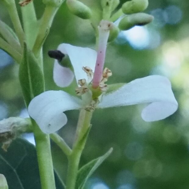 夏から秋にかけて、 赤みを帯びた白い花が穂になって咲きます。 細長い花びらはクルンと外側にカールします。