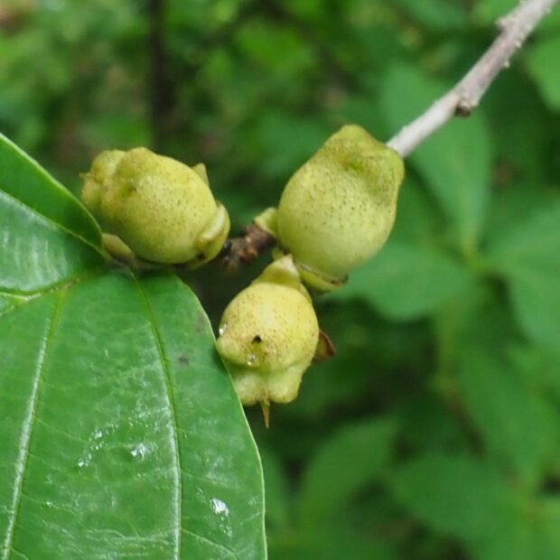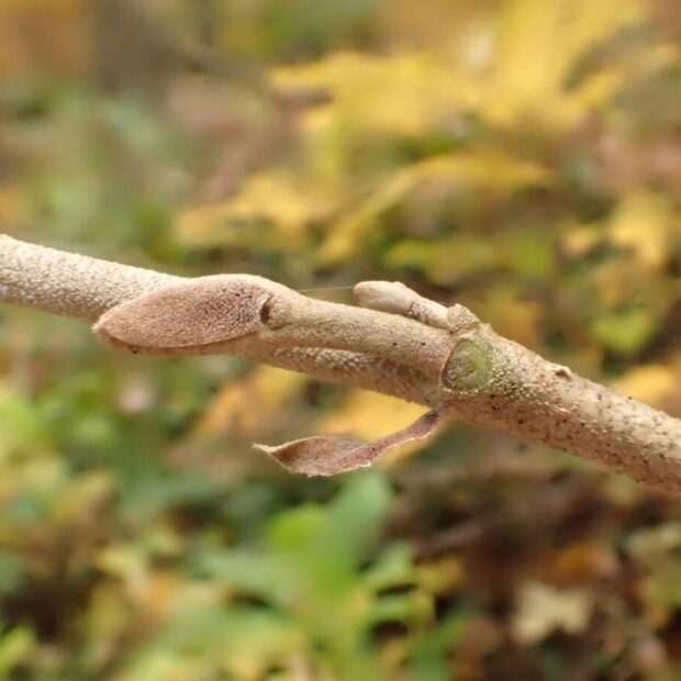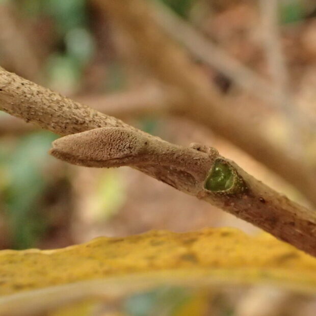 薄い茶色の芽鱗には細かい毛があり、 芽には柄があります。 葉痕の維管束痕は3つでお顔に見えます。