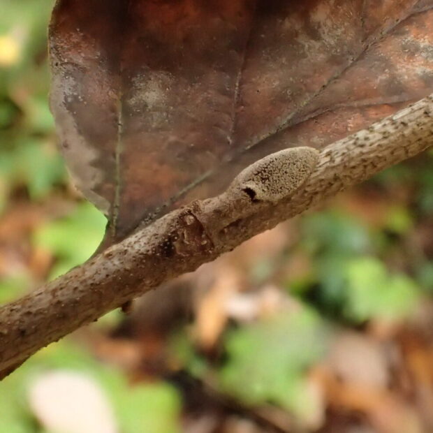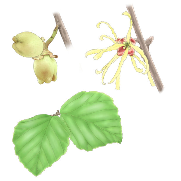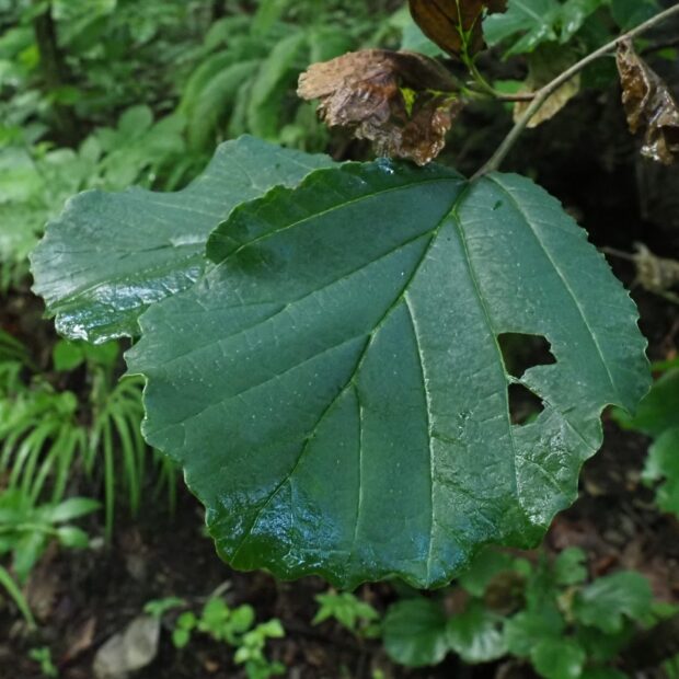 マンサクに似たゆがんだ平行四辺形のような形で、 葉先が丸いので、 扇型にも見え、 ずんぐりした印象の葉っぱです。 葉の表にも裏にも毛はほとんどありません。