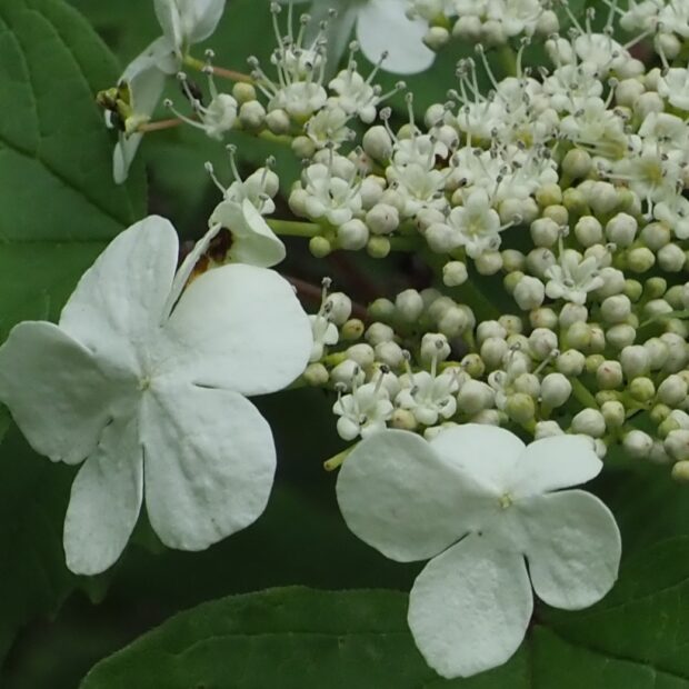 枝や葉柄、 花柄に毛があるものを「ケカンボク」とよびます。 観賞用に栽培されている「テマリカンボク」には両性花がなく、 多数の装飾花が集まってボール状になり、 手毬のように見えます。