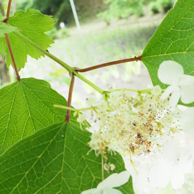 春にガクアジサイのような白い花を咲かせる低木です。 花の周りに大きな白い装飾花がぐるりと咲き、 後から真ん中に集まる小さい花が咲きます。