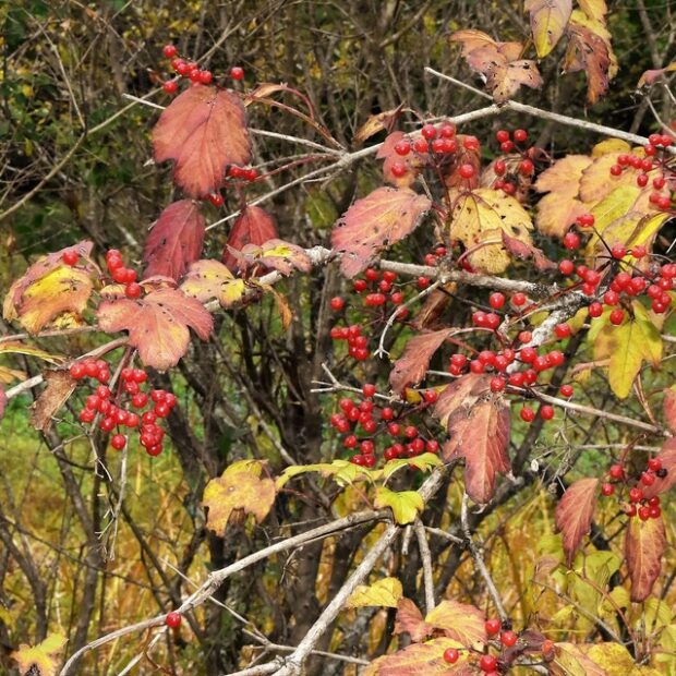 秋になると小さな赤い実をたくさんつけます。 熟しても苦味が強く、 鳥たちにも不人気かも。 葉が落ちても赤い実だけが枝にたわわに残ります。