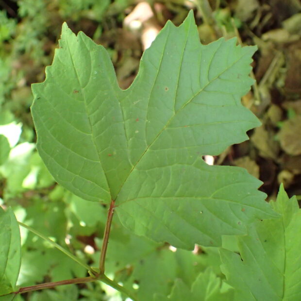 対生で、 カエデのように分裂した葉です。 分かれた葉の先の方にギザギザがあるのが特徴ですが、 ギザギザがない葉もあります。