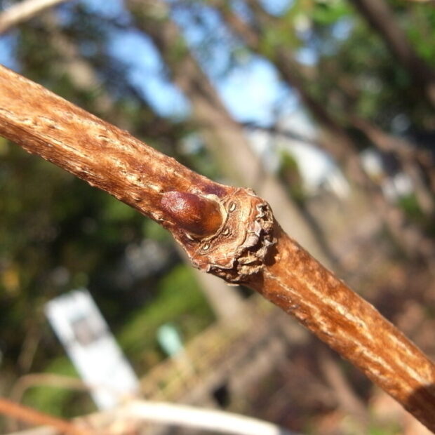 黒っぽい赤い色の芽です。 芽鱗は1枚につながり、 帽子のようにスポッととれる形をしています。 帽子をスポッと脱いでも中にも帽子をかぶっていて、 それはベトベトしています。 葉痕の維管束痕は3つでお顔に見えます。