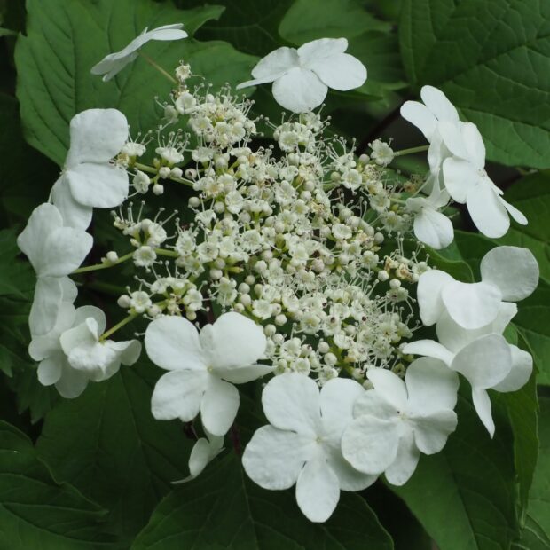 中心に小さな花が集まり、 その周りに白い花が飾りのようについています。 ガクアジサイに似ていますが、 装飾花も中心の花も密に並びます。