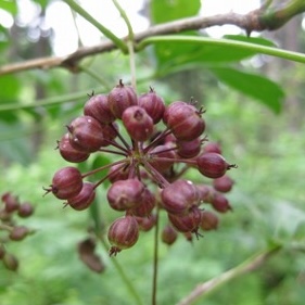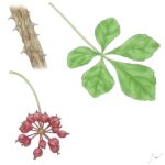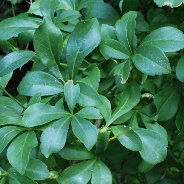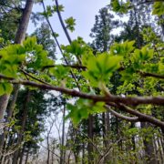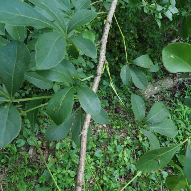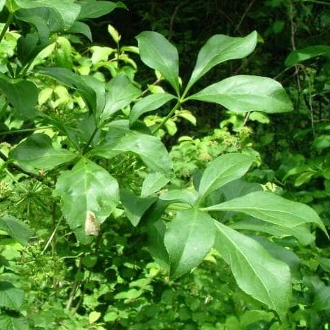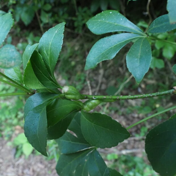 少し明るく湿気のある山野に生えています。 5枚で一組の葉と、 葉のすぐ下につくトゲが目印。 若葉が「おひたし」や「ウコギ飯」などとして食べられます。 初夏には小さい黄緑色の花を咲かせます。
