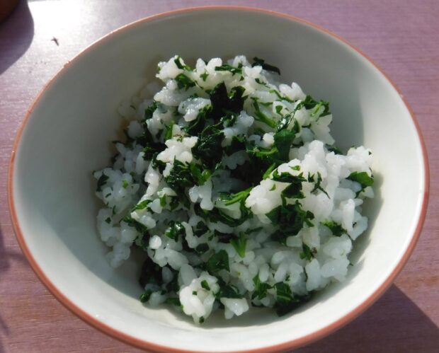 ウコギ飯の作り方 : 葉っぱの部分だけ収穫します。 軽く湯がいて、 水にさらしてから絞り、 塩をウコギにまぶします。 塩の分量は、 重量の10%くらいが標準ですが、 好みと健康状態に合わせましょう。 それを温かいごはんにまぜます。 塩がごはんになじんだら「いただきまーす♡」