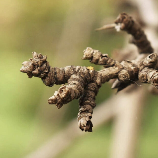 樹皮は黒っぽい灰色で、 縦の筋とポコポコした皮目がたくさんあります。 枝にはトゲがたくさんあり、 横から見ると鋭いくちばしをもつ鳥の頭のように見えます。