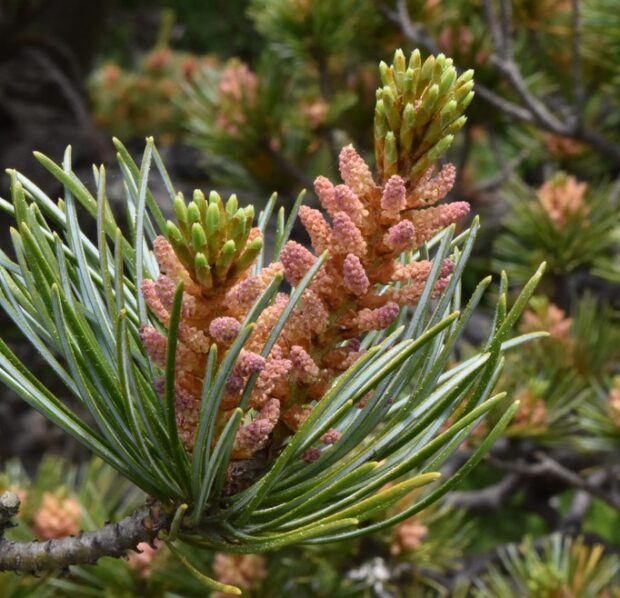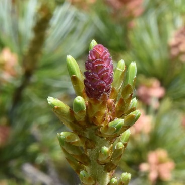 雌花は新しい枝の先に2~3個つき、 鮮やかな赤っぽい紫色です。 春咲いて翌年の秋に松ぼっくりになります。