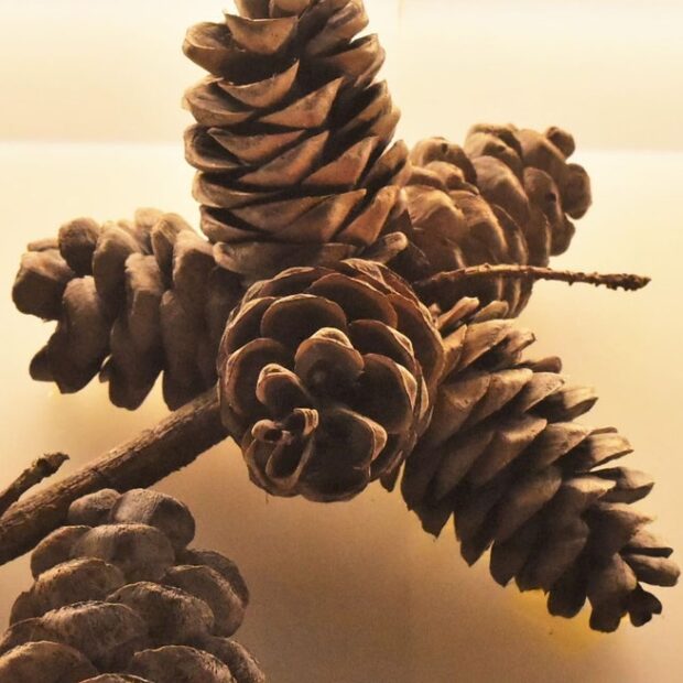 実は松ぼっくりです。 うろこのようなひだの間に翼のついたタネが入っています。 熟した実は、 湿っているときはひだが閉じていますが、 乾燥すると開き、 タネが風に乗って飛んでいきます。